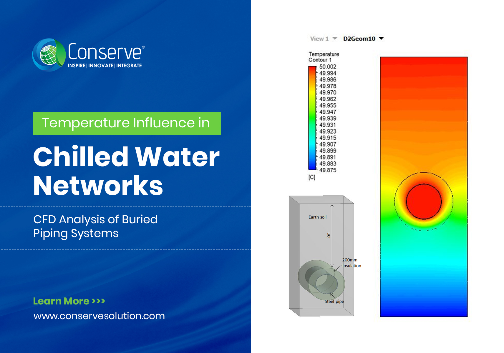 Conserve’s scope of Work in this project was to analyze the temperature influence in the externally buried Chilled Water network using Computation Fluid Dynamics Tool. The core intend behind the analysis was to determine the thickness of the Insulation Material – Chilled Water Pipes.