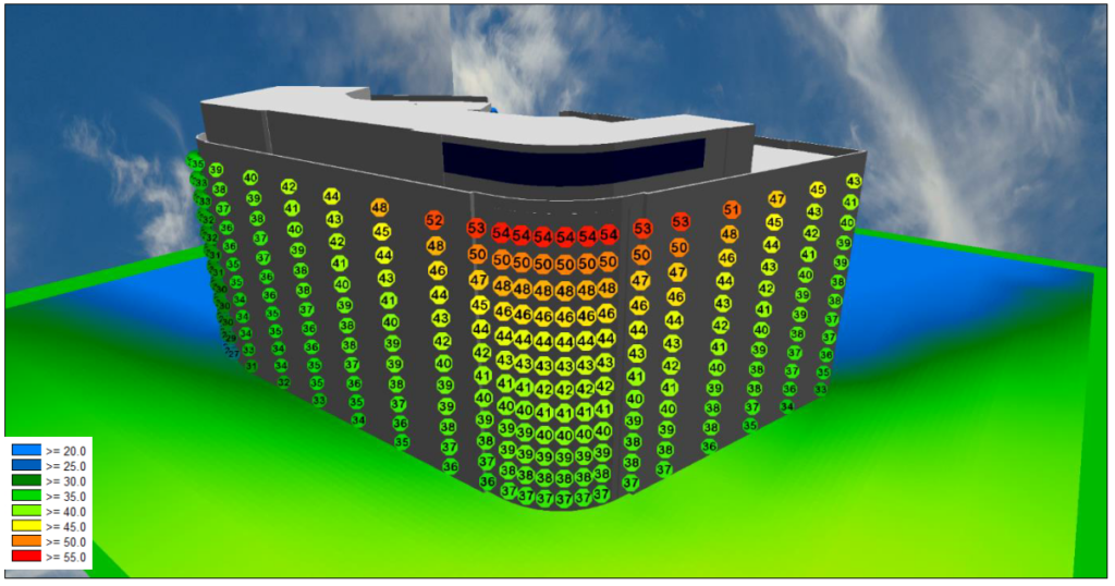 • When physical monitoring is not feasible (e.g., during future development stages), environmental noise simulation involves using computer models to predict noise levels at various locations based on factors like the building’s design, surrounding environment, and distance from noise sources. This technique involves creating visual representations (maps) of noise levels in and around the building. Noise maps help identify areas with higher noise exposure at the different direction and levels of an, enabling targeted mitigation plan for the facade design.