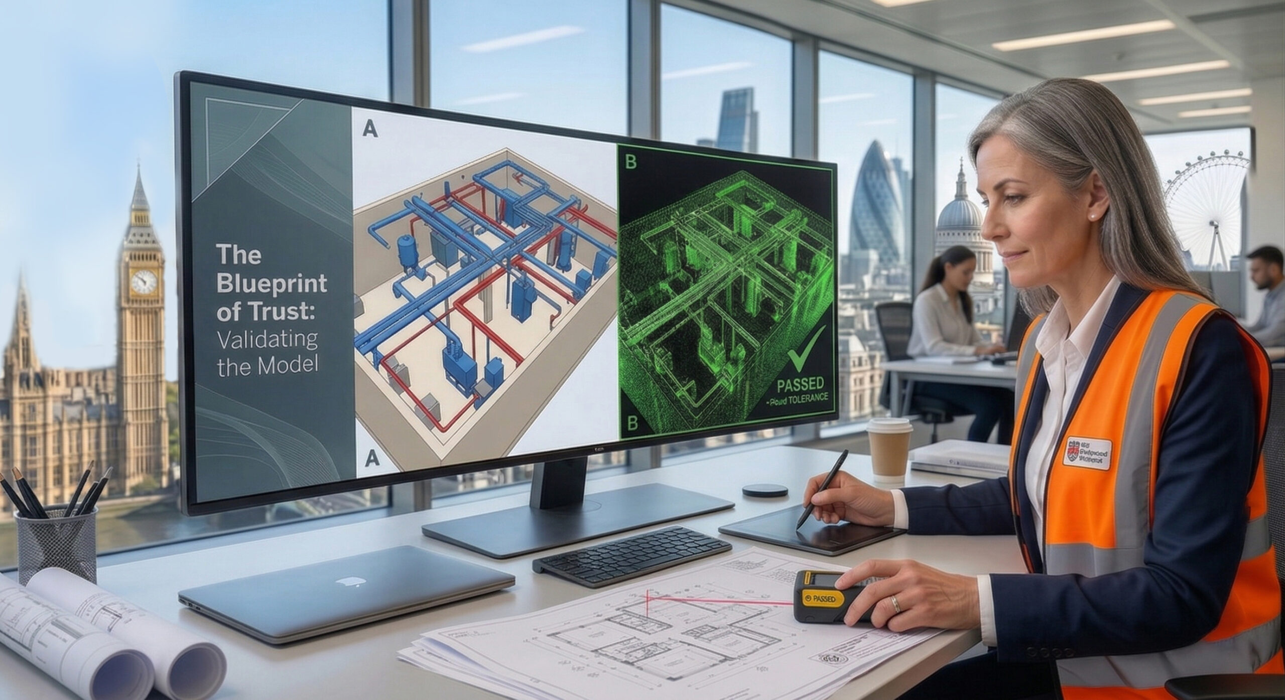 Every professional provider should verify their model against the point cloud before issue. The check should confirm that modelled elements correspond to actual site conditions within the agreed tolerance, that no elements are missing, and that the model is structurally sound: no duplicate geometry, correct workset setup, clean IFC export.