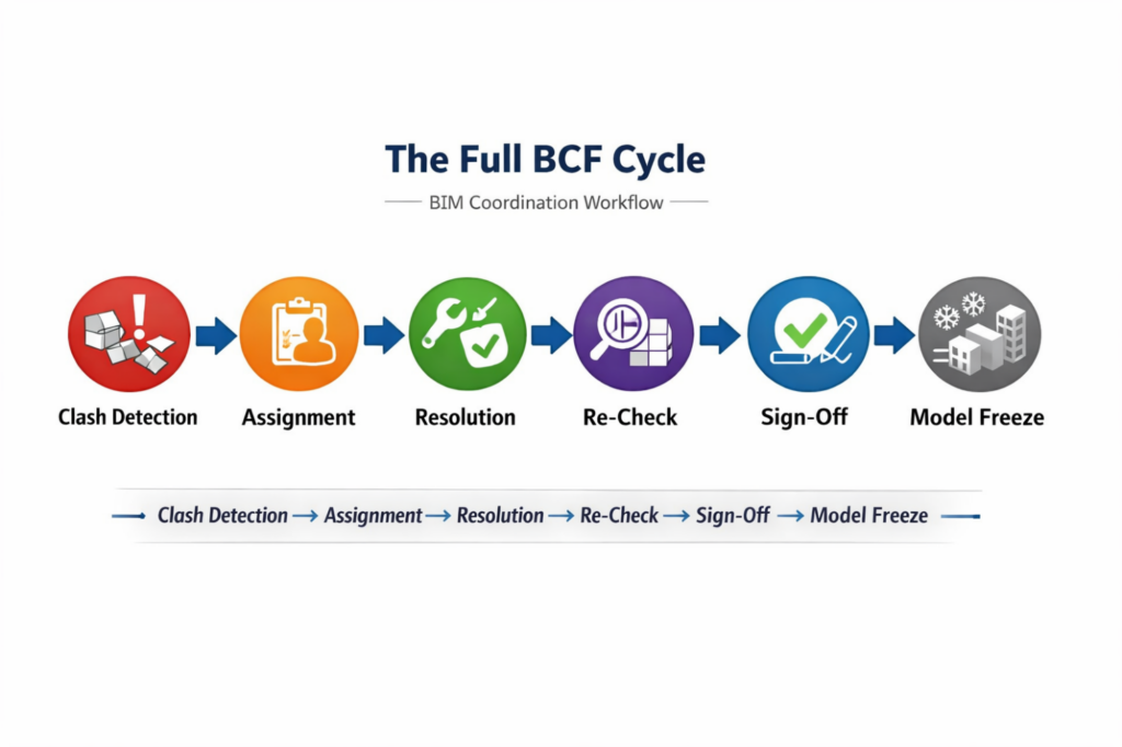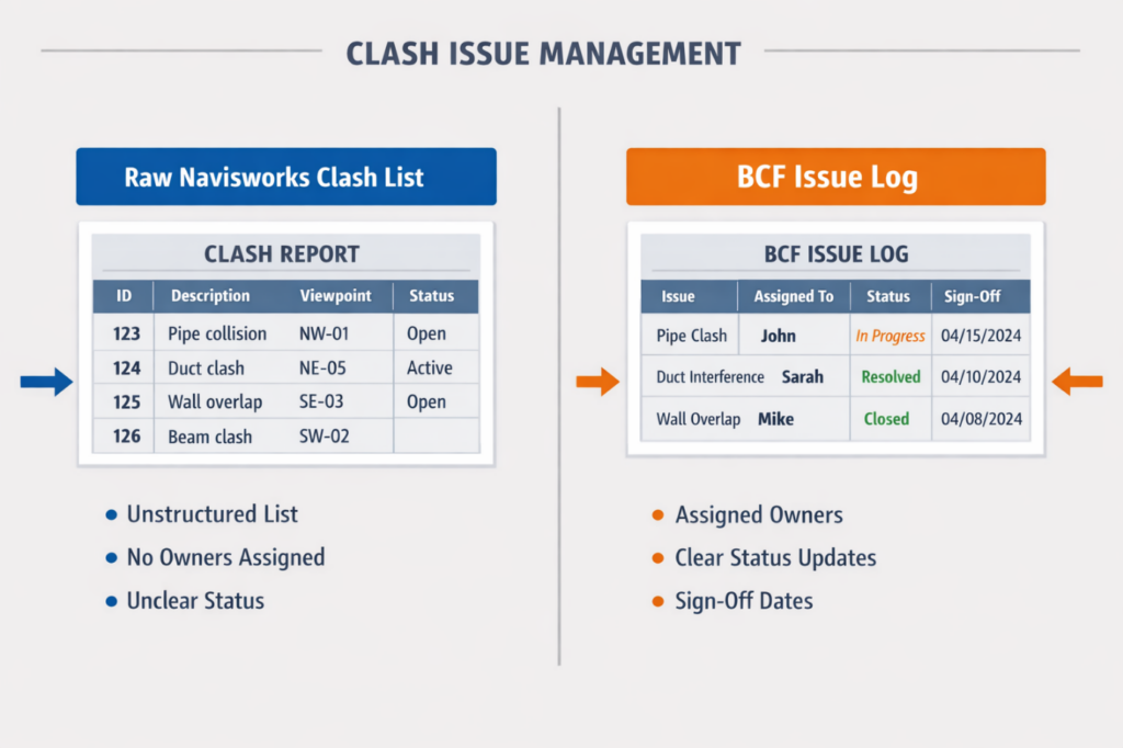 Every clash identified in Navisworks should be exported as a BCF issue, assigned to the responsible discipline lead, given a resolution deadline, and re-checked by the BIM Coordinator once the fix has been made. The BCF log is the coordination record of the project. At model freeze, it should show every clash raised, resolved, verified, and signed off. That log – not the clash report – is the evidence of coordination.